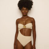 Maiô tomara que caia com acessório de metal próprio para moda praia.