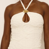 Vestido tomara que caia, curto decote em gota e acessório.